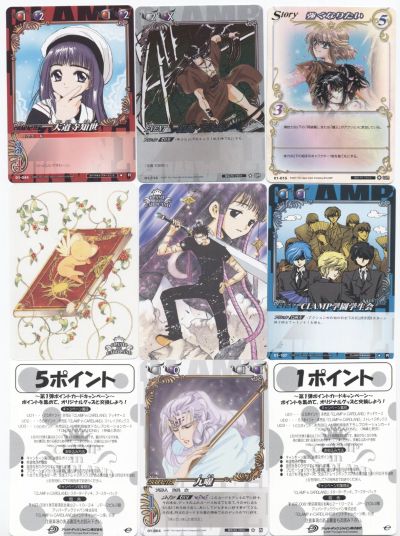 Como curiosidad comentaros que las cartas están divididas por colores, las de Wish y RG Veda son blancas, las de Clamp. Club de Detectives y Chobits son azules, las de X y XXXHOLIC son blancas y las de Card Captor Sakura y Tsubasa Reservoir Chronicle son purpuras.
