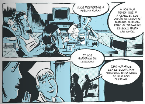 El cómic trata de enfocarlo de forma objetiva, reflejar las diferentes situaciones como si se tratara del punto de vista de un observador externo. Además el dibujo de Jordi también ayuda, al no ser un dibujo realista, aligera un poco el tono dramático.