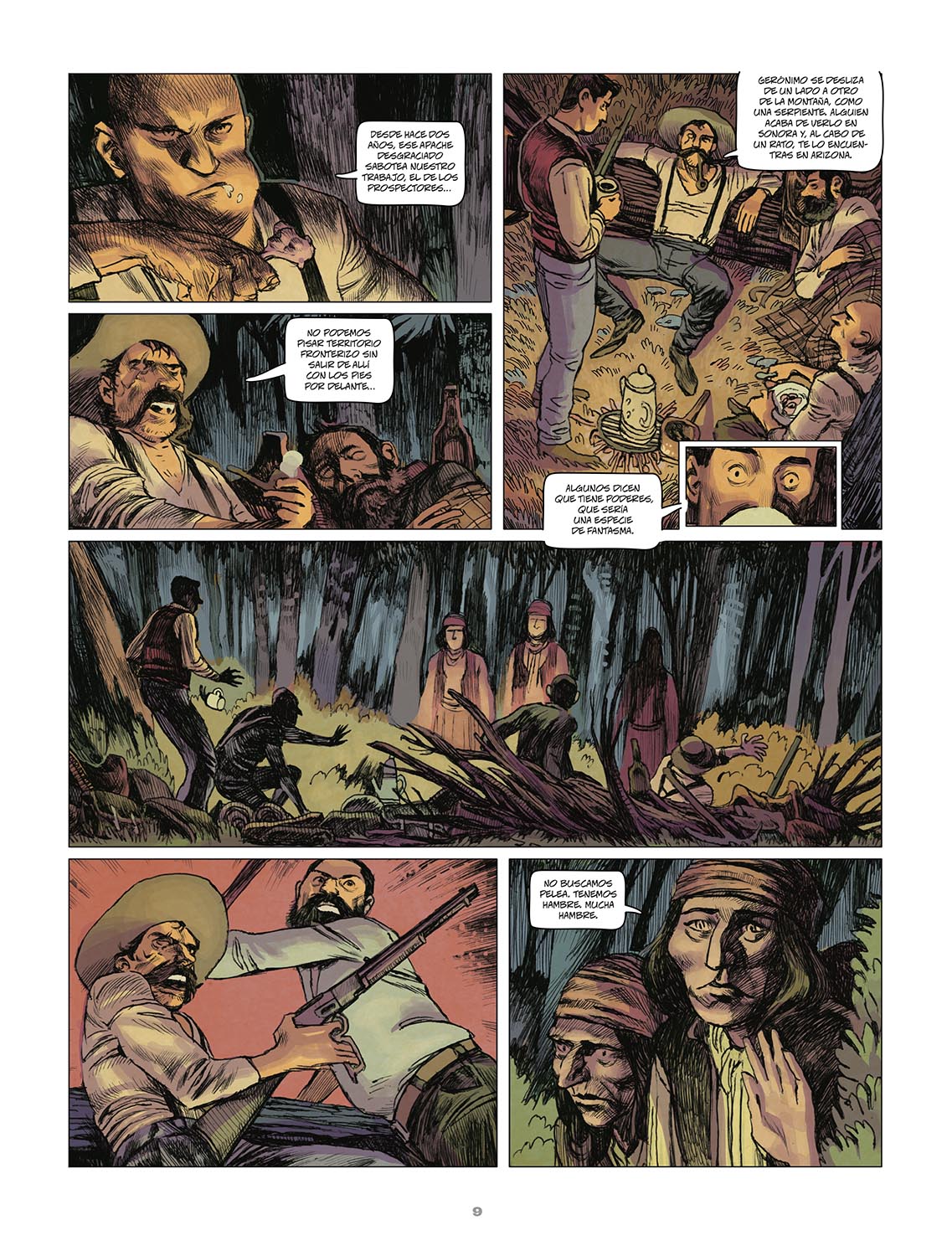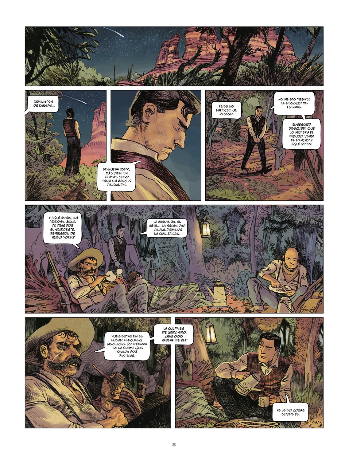 La historia comienza, no obstante, con otro personaje central, el que da título a esta novela gráfica: el artista neoyorkino Frederic Remington, quien pasará a la posteridad como el gran retratista del Oeste americano. Enviado a Arizona por la revista Harper's Weekly como corresponsal para cubrir la guerra del gobierno contra Gerónimo –cuya captura parece inminente–, Remington es un testigo privilegiado de las transformaciones que se están produciendo en la región, lo que va a marcar un punto de inflexión fundamental en su incipiente carrera. Los historiadores no han podido demostrar que alguna vez se encontrara con el líder de la revuelta apache en la reserva de San Carlos, pero la novela gráfica ha querido jugar con esa posibilidad: un cruce de caminos entre un talento emergente y un rebelde en su ocaso.