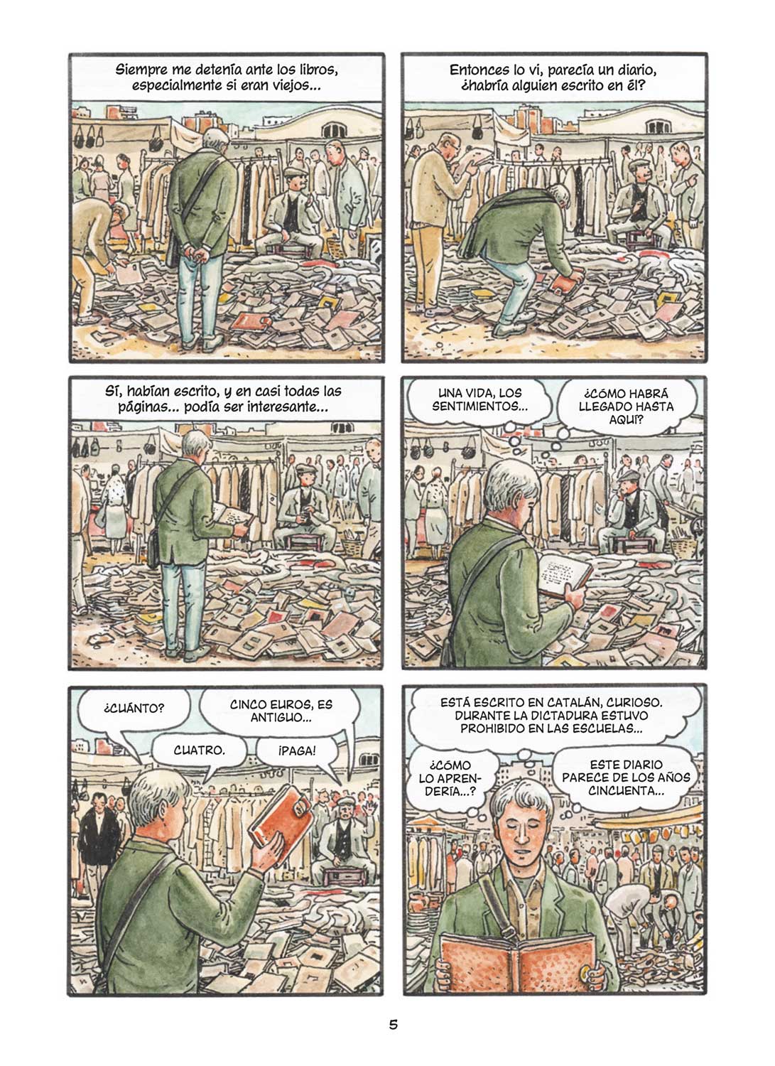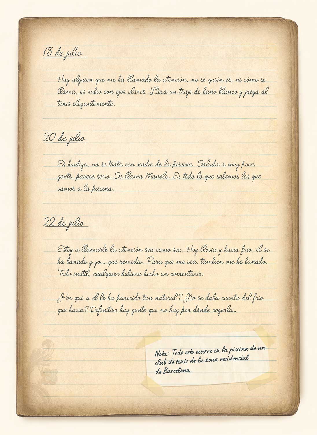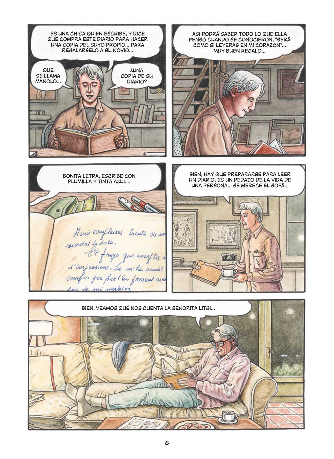 El hallazgo, que a Kim le parece salido de la década de los años 50 del siglo pasado, está escrito en catalán en una época en la que la dictadura prohibió su enseñanza en las escuelas. Pero la intriga y las ganas de adentrarse en los secretos de otra vida apenas han empezado. Respetuoso pero raudo, Kim descubre como la bonita letra en el interior, escrita con plumilla y tinta azul desvela que la autora fue una chica que compró el diario hallado para hacer una copia del suyo propio para regalárselo a su novio, que se llamaba Manolo. Así, la que será protagonista de la apasionante vida que nos espera en la página siguiente, desnuda completamente su alma desvelando todo lo que ella pensó y sintió cuando se conocieron. “Será como si leyeras en mi corazón”, afirma, de hecho.