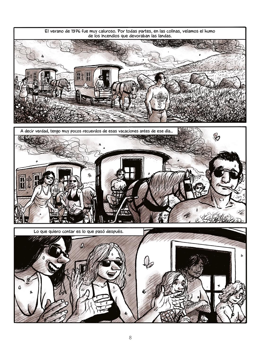 El relato comienza en el tórrido agosto de 1976, en Finisterre, cuando el autor contaba 18 años. Todo parece indicar que serán unas vacaciones en familia al uso, recorriendo los caminos rurales en caravanas tiradas por caballos. Junto a Tripp viaja su madre y sus hermanos Dominique, de 14 años, y Gilles, que cumplirá 12 en pocos meses.