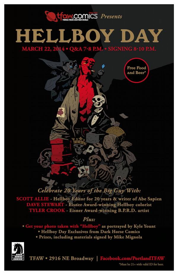 Además, en varios de los establecimientos estarán presentes varios autores relacionados con Hellboy como Tyler Crook, Scott Allie, Dave Stewart, Laurence Campbell o el propio Mignola. Un día para celebrarlo junto a algunos de sus creadores favoritos, ganar increíbles premios y pintar la ciudad de rojo.