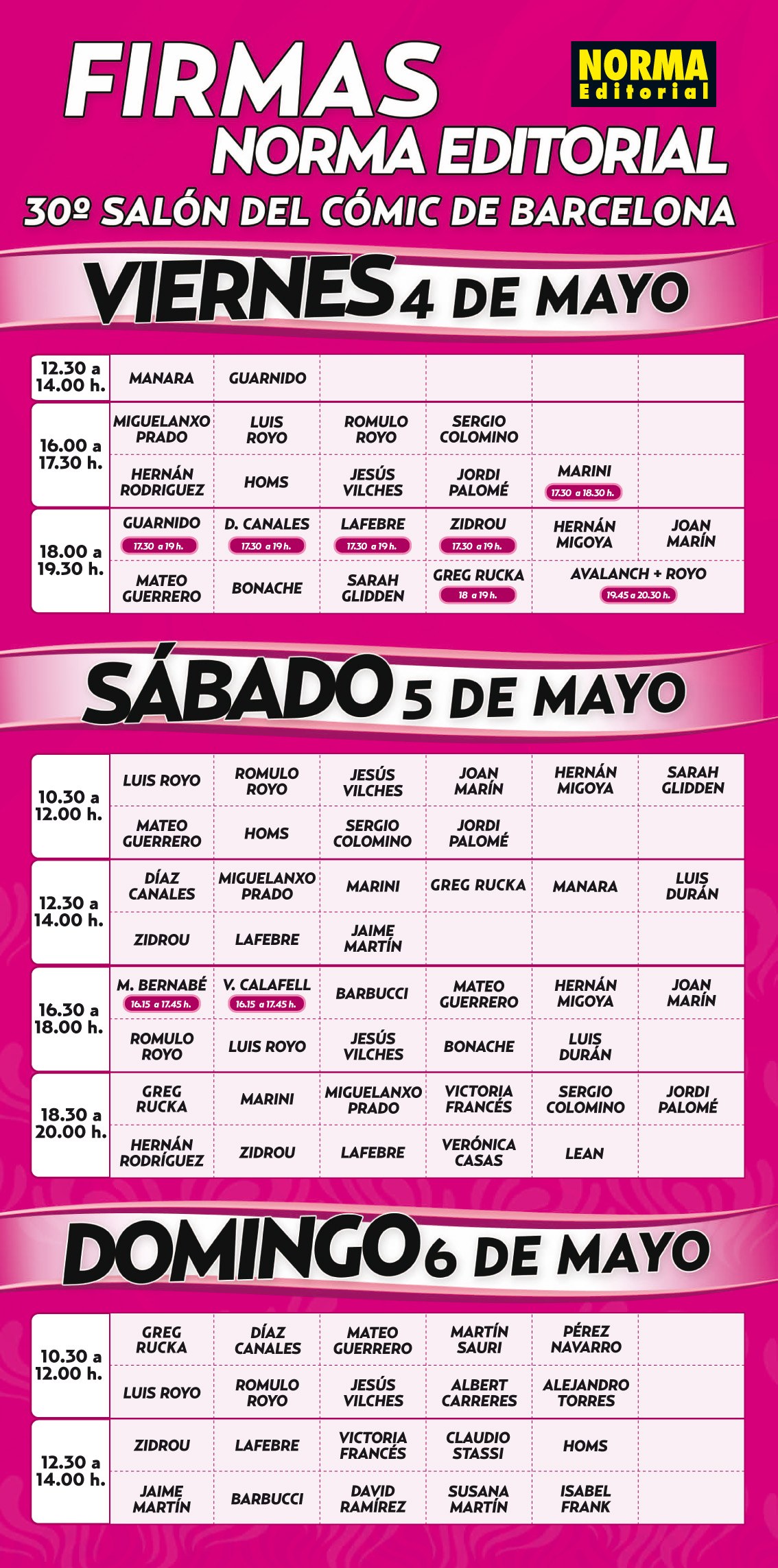 Estamos a un día de la inauguración del 30 Salón del Cómic de Barcelona, y por fin os traemos los horarios de las firmas de nuestros autores. Ya podéis sacar vuestras agendas y apuntaros los encuentros, porque esta edición promete ser espectacular ¡no podéis faltar!
