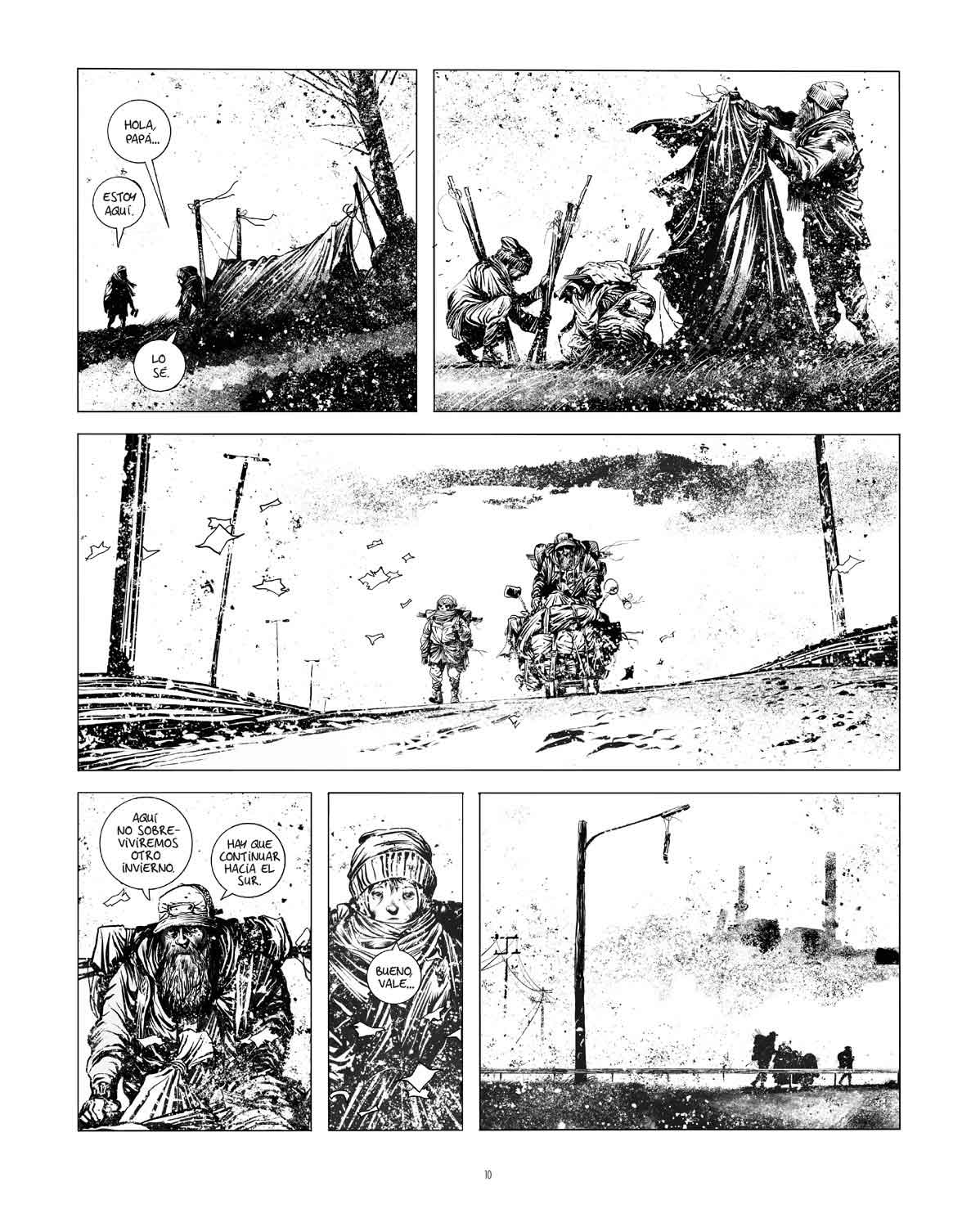 “En La carretera había un universo sin vida, de paisajes apocalípticos, rotos, sucios, mugrientos incluso, y sobre todo muertos. Un escenario sin naturaleza, sin hojas, sin animales. Tuve miedo de no conseguir aguantar hasta el final porque toda esa frialdad me superaba”, explica el creador. “Por otro lado, hacer un álbum sin acción y con muy pocos diálogos es todo un reto. Cuando el autor de la novela describe un paisaje en un cuarto de página, yo a veces necesito tres o cuatro para transmitir la misma impresión”.