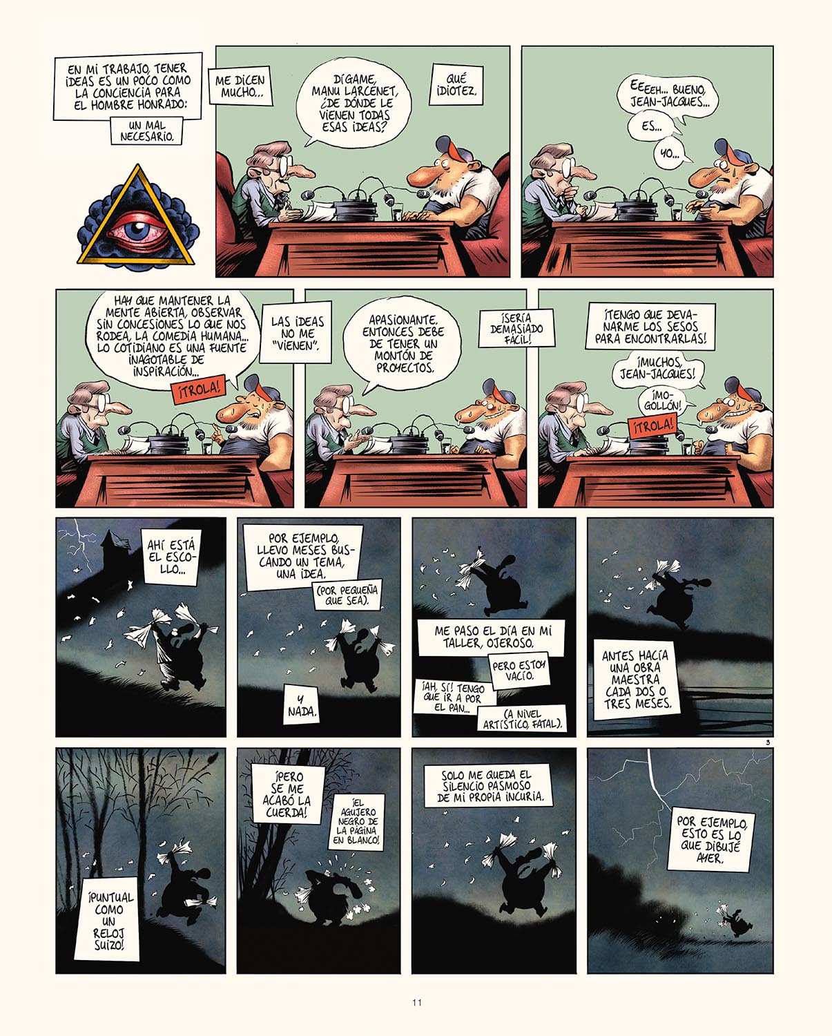La historia comienza con Jean-Eudes de Cageot Goujon, más conocido bajo el seudónimo de Manu Larcenet, como un artista acabado. No siempre ha sido así: en tiempos anteriores había logrado concitar tanta fama y amasar tanto dinero, que era conocido como “el Donal Trump del arte”, según cuenta él mismo. “Pero eso era antes. Cuando tenía ideas”.