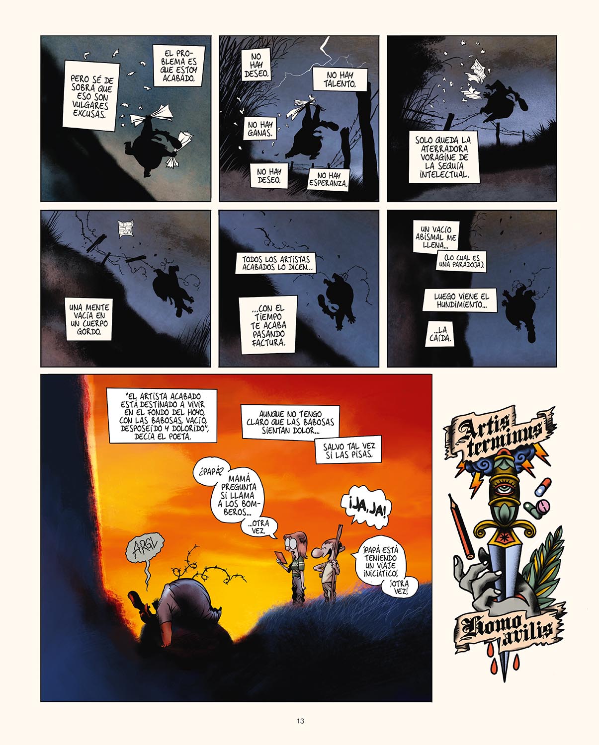 Recostado en su mesa de dibujo, ojeroso, contempla el agujero negro que se abre ante él, intenta emborronar hojas, pero todos acaban estrujados entre sus manos, camino de la papelera. Crear se ha convertido ya para él en una cuestión de supervivencia. Haciendo acopio de las pocas energías que le quedan, arrojándose sobre todos los espejismos, el dibujante va de fracaso en fracaso, de soledad en soledad, para levantarse cada día más y más hundido, destrozado. Pero, paradójicamente, es entonces cuando el artista va a dar lo mejor de sí mismo, desplegando ante el lector un enorme abanico de imaginación, virtuosismo gráfico y humor.