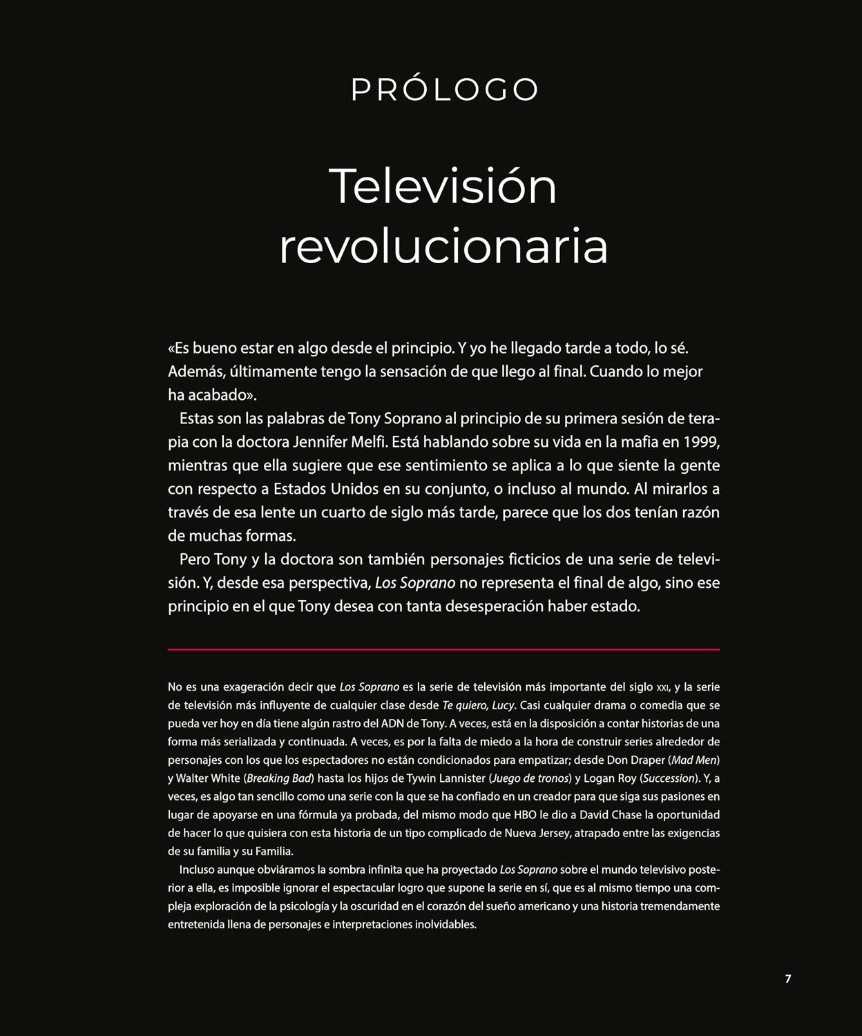 Mucho más que una simple guía, se trata de un exhaustivo álbum fotográfico que se completa con análisis temporada a temporada, materiales de archivo inéditos y entrevistas exclusivas con el creador de la serie, David Chase, el reparto y el equipo técnico. Una compilación definitiva para profundizar en la psicología de ese jefe del crimen organizado necesitado de terapia para aliviar sus problemas, así como de sus complejas dinámicas familiares y las contradicciones morales que reformularon la narrativa de la pequeña pantalla. El hecho de ser la primera producción de cable en ganar el Emmy a la Mejor serie dramática fue solo el primer síntoma de su enorme trascendencia.