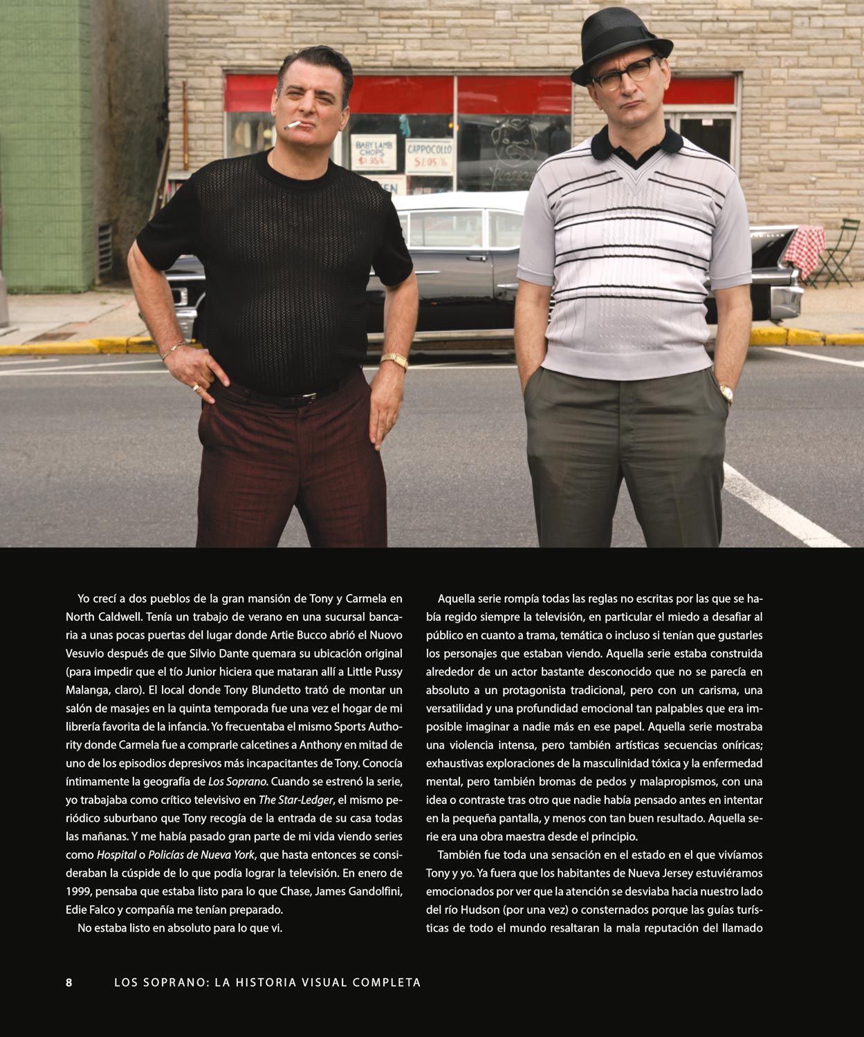 El propio David Chase fue, según asegura en estas páginas, el primer sorprendido con la repercusión de Los Soprano. “Lo que pensé al principio fue ‘Dios, nos hemos dedicado a esto en cuerpo y alma, y creo que estamos fracasando’. Pero, en fin, ya no pienso igual”, dice sarcástico en su entrevista. Junto a las aportaciones de Chase, se recogen en el volumen otras declaraciones de miembros del elenco y el equipo como Edie Falco, Lorraine Bracco o Steven Schirripa, entre muchos otros.