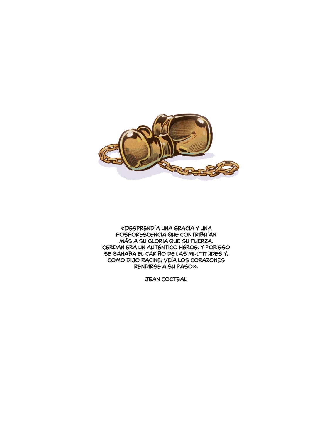 Marcel Cerdan. El corazón y los guantes condensa dos logros que la historia o la memoria selectiva no pueden borrar y que siguen haciendo de este boxeador y su historia impregnada de gran dramatismo el hilo narrativo ideal para contar en cómic. El primero es que, tras la guerra, los puños imbatibles de Marcel le condujeron por méritos propios hasta Estados Unidos donde, el 21 de septiembre de 1948, se enfrentó oficialmente al campeón mundial de los pesos medianos, Tony Zale, conocido como “El Hombre de Acero”. Y Marcel le tumbó, convirtiéndose en el primer campeón mundial de Peso Mediano no nacido en los Estados Unidos. Semejante logro, tras la gran humillación sufrida por los franceses con la derrota de 1940, y el gran trauma posterior de la ocupación y el colaboracionismo, convirtió el triunfo de Marcel en el orgullo de una nación francesa que se reconstruía a si misma tras la Gran Guerra.