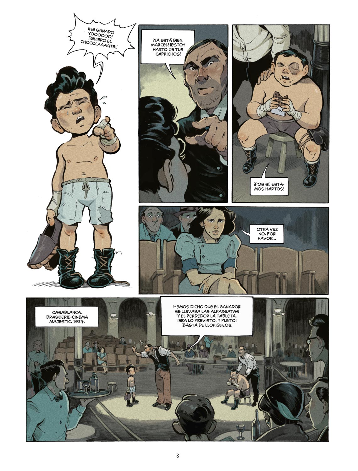 Marcel Cerdan. El corazón y los guantes es el primer cómic sobre la vida de este gran boxeador ya que sólo una película, Édith et Marcel de Claude Lelouch y la novela Constellation de Adrien Bosc recogen parte de la agitada vida de Marcel Cerdan, nacido el 22 de julio de 1916, en Sidi-Bel-Abbés, Argelia, y criado en Marruecos, concretamente en Casablanca cuando Marruecos aún era un protectorado francés. Como recuerda Bertrand Galic en su ordenada narración, que acompaña a Marcel en viñetas pulcramente iluminadas por el detallado trabajo de Jandro, desde que era apenas un niño, éste odiaba el boxeo y prefería jugar al fútbol, deporte donde también destacaba. Pero obligado por su padre y arropado por el amor incondicional de su madre, ambos emigrantes “pieds noirs” venidos de Alicante (Aspe), acabó debutando como boxeador profesional en 1934, cuando apenas tenía 18 años.
