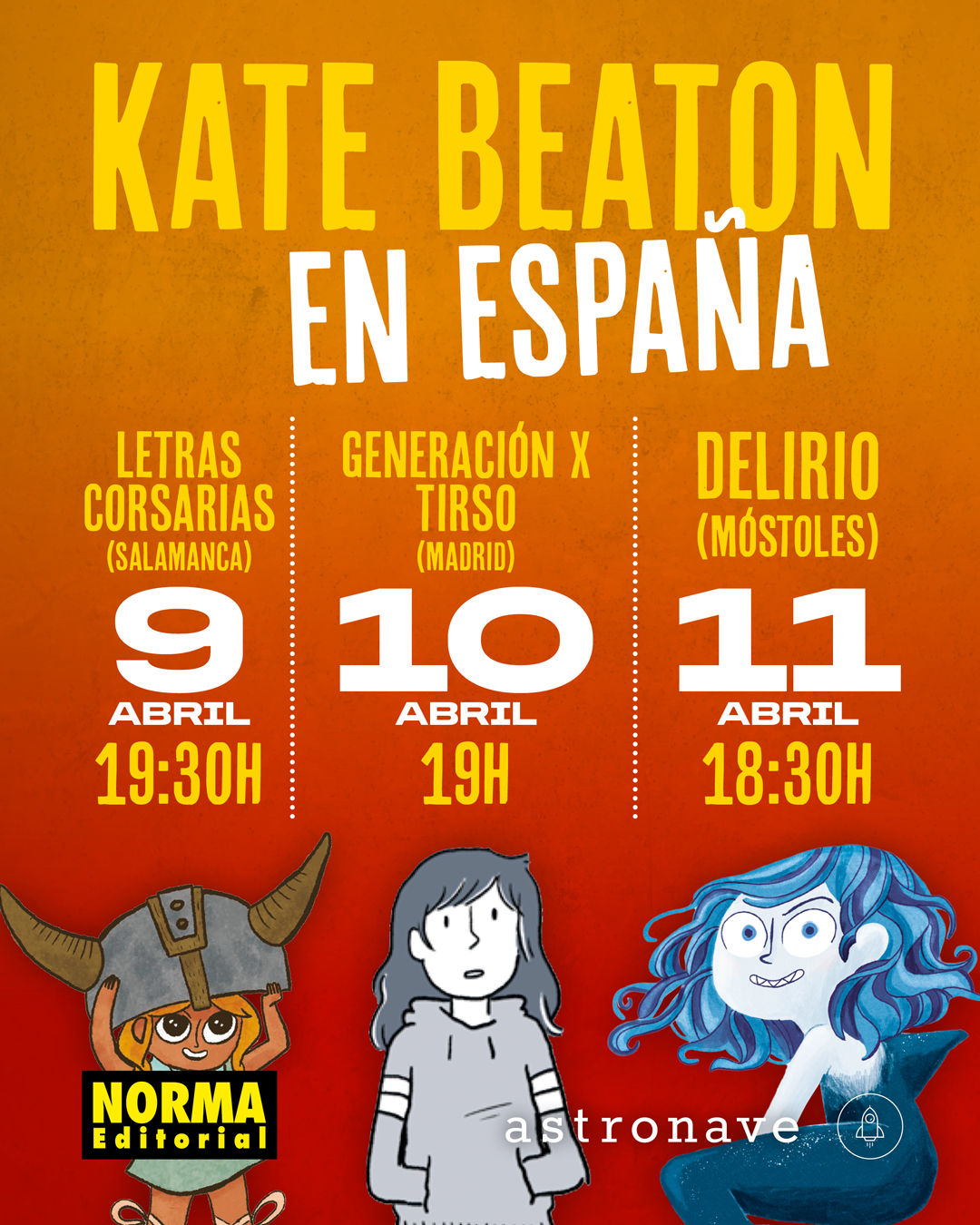 La exitosa autora de Patos, La princesay el ponio La Tiburonilla, Kate Beaton, visitará España y hará una ruta de firmas por diversas librerías. En la imagen tenéis toda la información de los horarios.