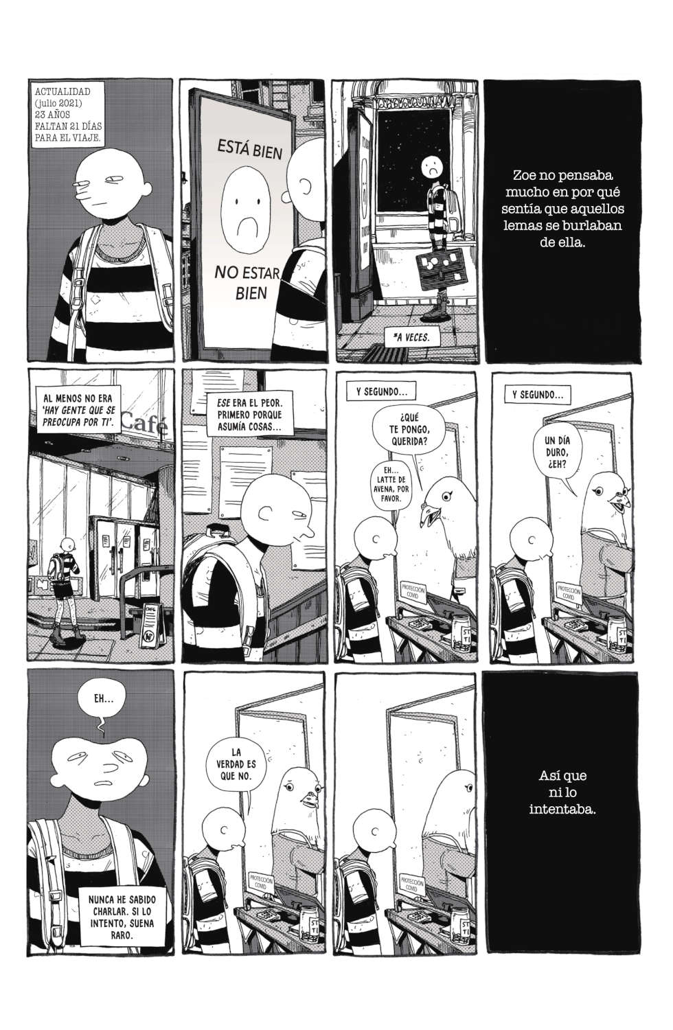 Se está muy sola en el centro de la tierraes la crónica se seis meses de lucha contra los propios demonios interiores, reflejada con múltiples recursos gráficos —tanto en blanco y negro como en color— que van desde las visiones surrealistas a los guiños al universo de Hayao Miyazaki. Todo ello discurre en un torrente de imágenes y palabras que pueden llegar a ser contradictorias y hasta perniciosas, pero que página tras página van arrojando luz sobre los abismos de la ansiedad y la depresión, mientras desvelan aspectos del pasado de la protagonista y de su familia.