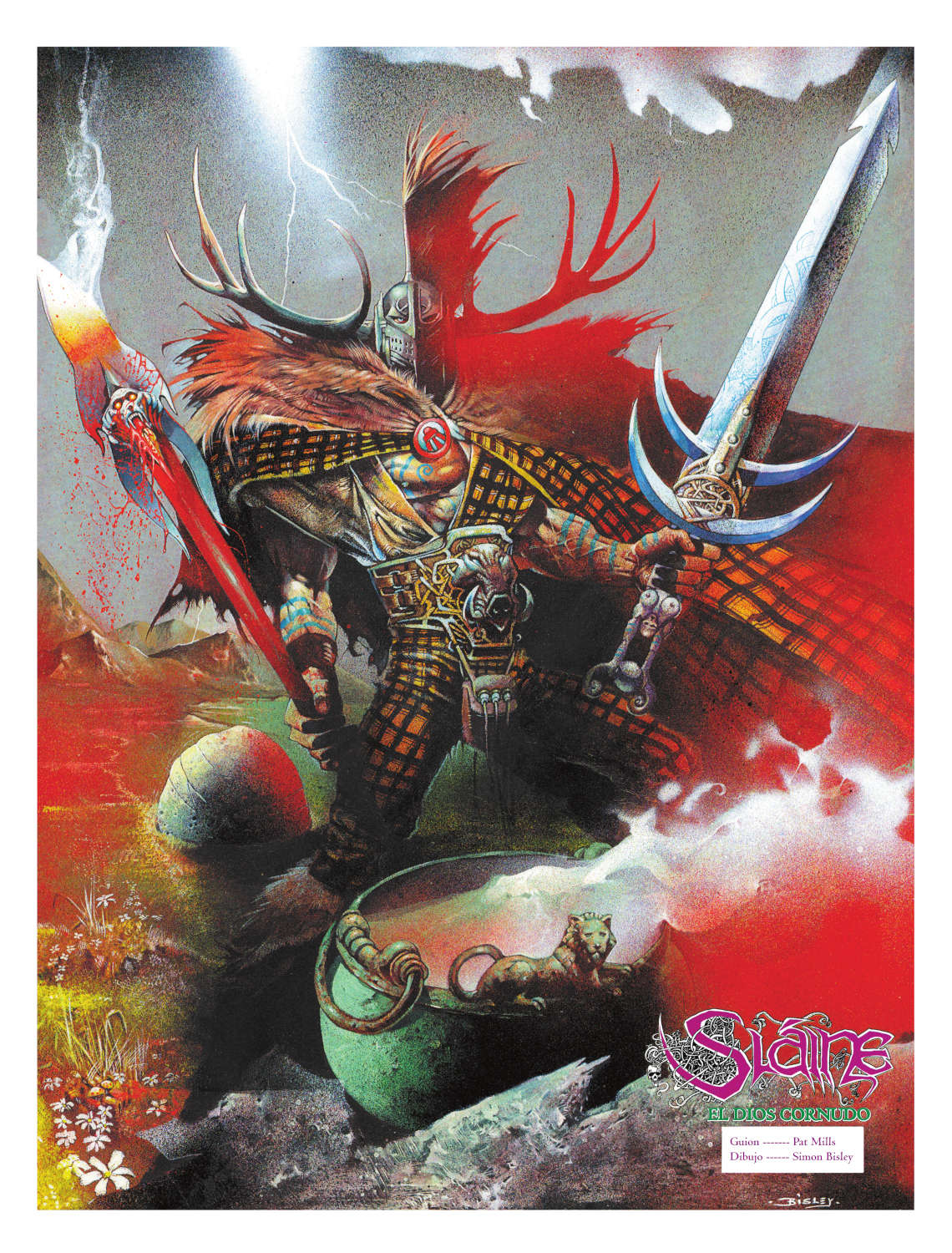La serie se convirtió rápidamente en una de las más populares de la revista 2000 AD porque, a los elaborados guiones espléndidamente ambientados de Mills, se unió siempre el talento de muchos artistas de trazo espectacular que comenzaban a ser mayúsculos en aquellos años: Massimo Belardinelli, Mike McMahon, Glenn Fabry… Y entonces llegó Simon Bisley. Proveniente del mundo de la ilustración, la forma en que este dibujante también británico era capaz de mezclar escenas de ultraviolencia con mujeres de exuberantes curvas y dioses olvidados e imposibles no solo llamó la atención de Pat Mills, sino de todo voraz lector de 2000 AD hasta el punto de que su aportación dando color y vida a Sláine: El Dios Cornudo, haría de este título una de las historias más populares en toda la historia de la revista, donde se publicó originalmente en tres entregas entre 1989 y 1990.