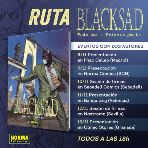 La saga de BLACKSAD es una de las más icónicas del cómic europeo, especialmente del género noir y del thriller. Tras una larga espera, Juan Díaz Canales y Juanjo Guarnido vuelven a deleitarnos con una nueva entrega de las aventuras del detective felino más intrépido del noveno arte. Celebramos el regreso de John Blacksad con un tour de firmas que llevará a los autores por toda España... ¡No os lo perdáis!